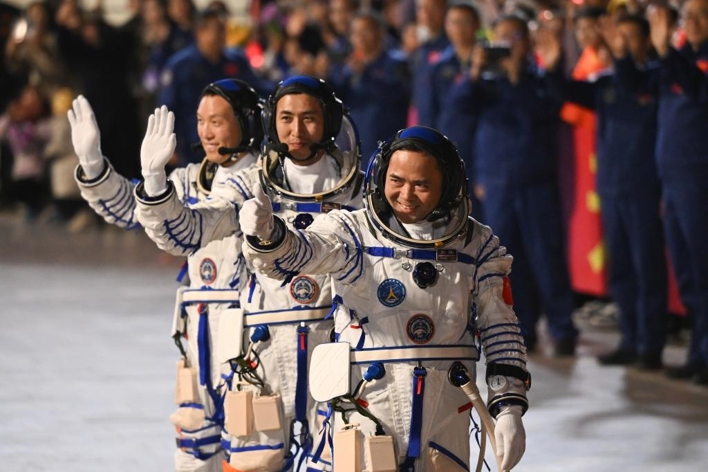 神舟二十一號航天員張陸、武飛、張洪章領(lǐng)命出征。