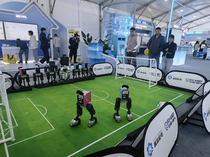 機器人在第八屆世界聲博會上進(jìn)行足球比賽(11月3日攝)。新華社記者 汪海月 攝