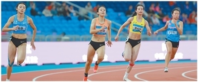 浙江隊(duì)選手陳妤頡(左二)在十五運(yùn)會(huì)田徑項(xiàng)目女子200米預(yù)賽中。本報(bào)記者 陶相安攝