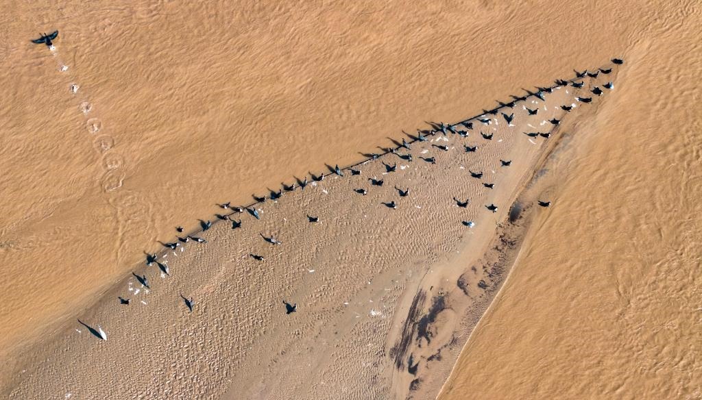 11月4日,在位于寧夏靈武市境內(nèi)的黃河,候鳥在河灘上駐足棲息(無人機照片)。新華社記者 楊植森 攝