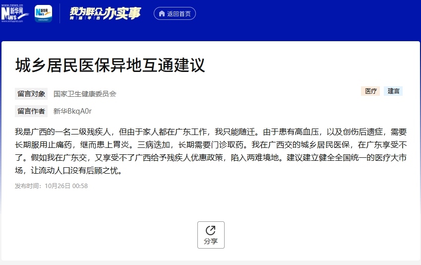 編者按:在醫(yī)療水平整體提升的大背景下,醫(yī)保權(quán)益保障等愈發(fā)受到社會各界的關(guān)注。近日,有網(wǎng)友在新華網(wǎng)“我為群眾辦實事”網(wǎng)絡(luò)平臺反映其在異地就醫(yī)中遇到困惑,《中國醫(yī)療保險》雜志為此邀請江西省醫(yī)保局待遇保障處原處長、原一級調(diào)研員蔡海清進行詳細(xì)解答。具體內(nèi)容如下: