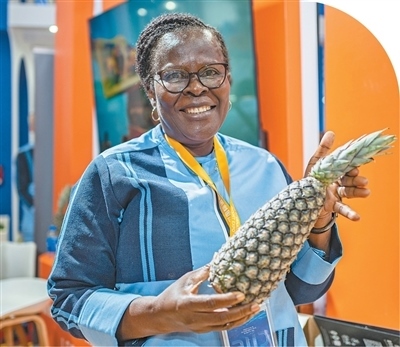 在第八屆進(jìn)博會(huì)國(guó)家綜合展上,貝寧國(guó)家館的工作人員展示貝寧奶油菠蘿。