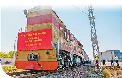 11月29日,一列滿載1000噸木薯淀粉的鐵路集裝箱班列從中老鐵路萬(wàn)象南站駛出,準(zhǔn)備發(fā)往河南鄭州。這是老撾首次成列運(yùn)輸輸華的木薯淀粉。凱 喬攝(新華社發(fā))
