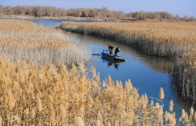 工作人員在策勒縣沙海玉湖下網(wǎng)捕撈螃蟹。湯永 攝