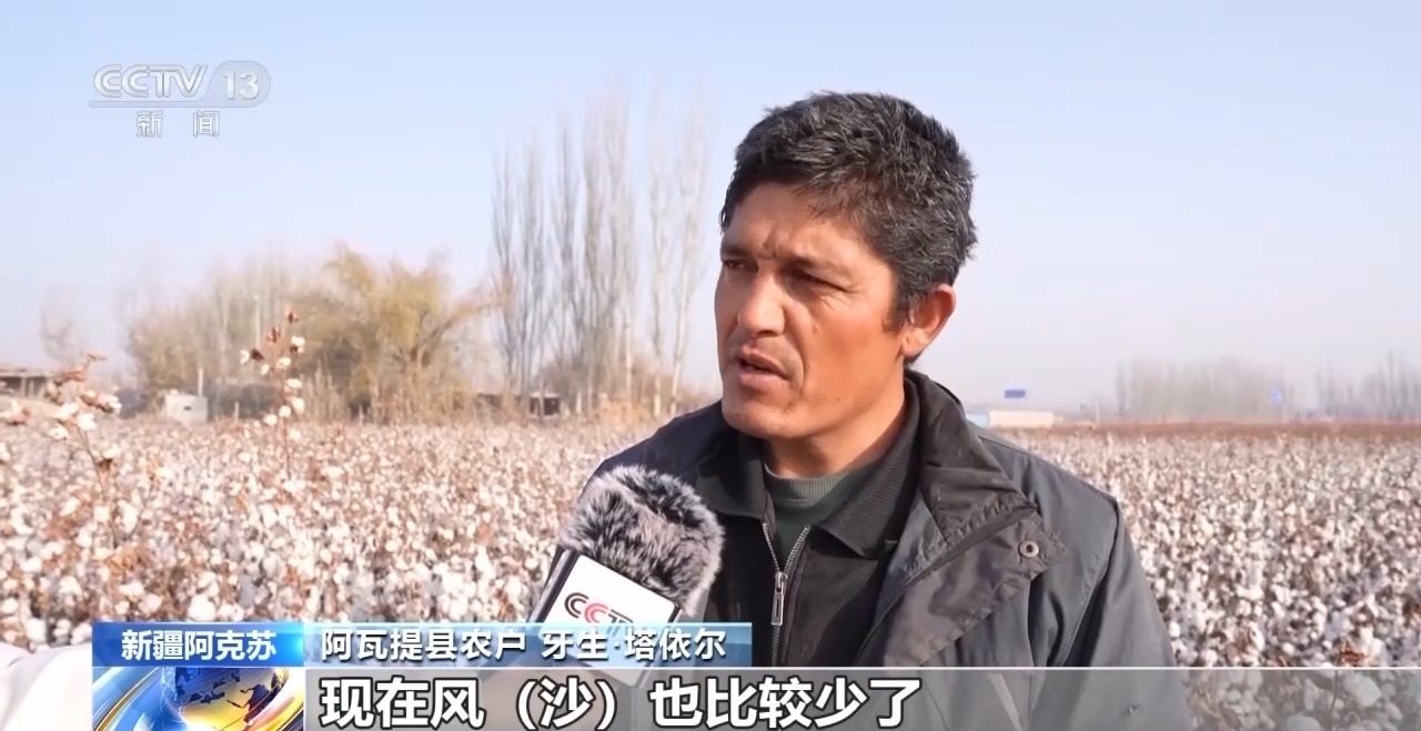 阿瓦提縣農(nóng)戶 牙生·塔依爾:種樹之后天氣變得很好,現(xiàn)在風沙也比較少了,棉花白白的,以前棉花上黃黃的,土太多了,以前一畝地200到250公斤,現(xiàn)在350公斤。