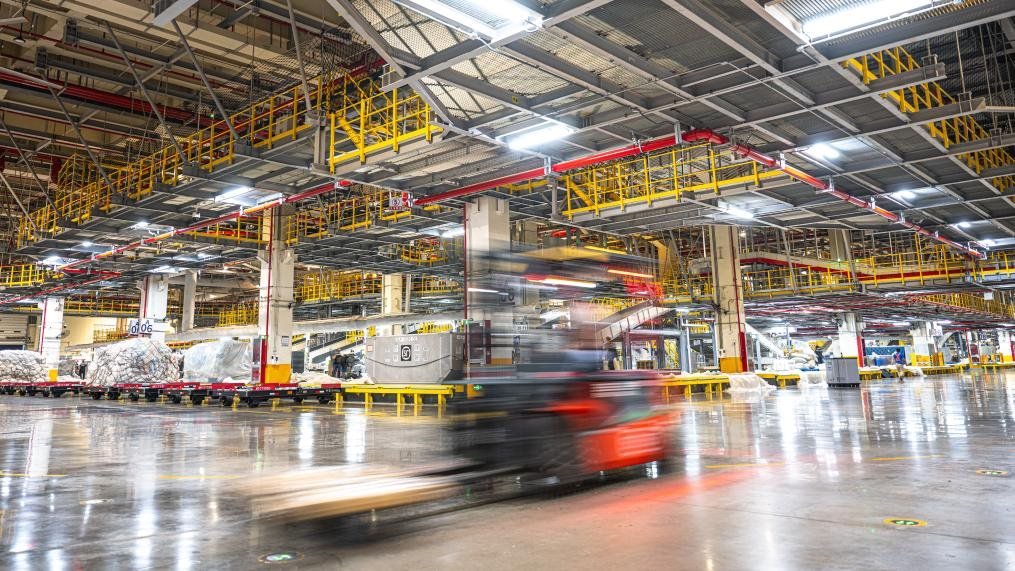 跟隨轉(zhuǎn)運車,記者來到了建筑面積達75萬平方米的機場“工”字形轉(zhuǎn)運中心。這里,“快點、快點”的催促聲與機器有節(jié)律的運行聲形成交響,在2萬多臺自動分揀設備和50多公里長傳送帶的支持下,工人們熟練地將數(shù)量規(guī)格不一的包裹抱起、分類、組合、打包,再拼裝出多個符合航空貨運規(guī)格和形狀要求的大包裹。