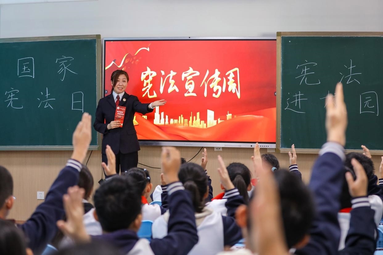 12月4日,在河北省石家莊市欒城區(qū)凌空橋路小學,欒城區(qū)法院的工作人員為學生們普及憲法知識。(工人日報通訊員 李明發(fā) 攝)