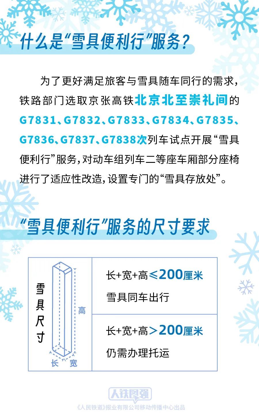 鐵路部門堅(jiān)持以人民為中心的發(fā)展思想,持續(xù)深化運(yùn)輸供給側(cè)結(jié)構(gòu)性改革,積極適應(yīng)旅客多樣化的出行需求,為攜帶雪具出行的旅客提供便捷服務(wù)。前期,鐵路部門按照《國鐵集團(tuán)鐵路旅客運(yùn)輸規(guī)程》“旅客乘坐動(dòng)車組列車隨身攜帶的行李物品長、寬、高之和不超過130厘米”的規(guī)定,對(duì)超過上述尺寸標(biāo)準(zhǔn)的雪具推出了“雪具快運(yùn)”服務(wù)。為了更好滿足旅客與雪具隨車同行的需求,鐵路部門統(tǒng)籌考慮旅客安全、乘車秩序和雪具運(yùn)輸需求,選取京張高鐵北京北至崇禮間的G7831、G7832、G7833、G7834、G7835、G7836、G7837、G7838次列車試點(diǎn)開展“雪具便利行”服務(wù),對(duì)動(dòng)車組列車二等座車廂部分座椅進(jìn)行了適應(yīng)性改造,設(shè)置專門的“雪具存放處”,旅客選擇該服務(wù)后可攜帶長、寬、高之和不超過200厘米的雪具同車出行,滑雪更加方便快捷。對(duì)于長、寬、高之和超過200厘米的雪具,由于高鐵列車車內(nèi)空間限制,仍需辦理托運(yùn)。