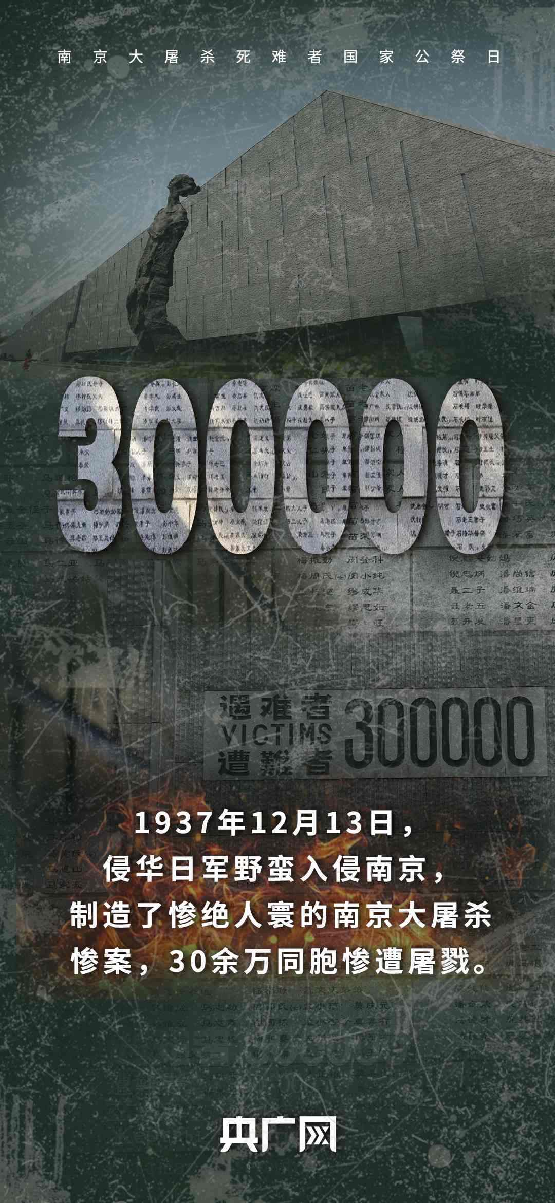 今天(12月13日)是第十二個(gè)南京大屠殺死難者國(guó)家公祭日。88年前,侵華日軍制造了慘絕人寰的南京大屠殺,這是一場(chǎng)持續(xù)40多天的人間浩劫,30多萬(wàn)同胞罹難……每一個(gè)數(shù)字,都在提醒著我們,曾經(jīng)的血與淚,不能忘,不敢忘!銘記歷史,珍愛和平,吾輩自強(qiáng)!