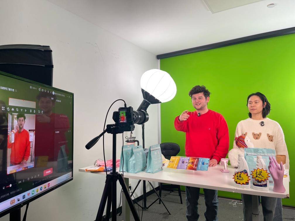 虹橋品匯直播基地的直播間內(nèi),不少“洋主播”正在鏡頭前帶貨。新華社發(fā)