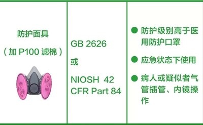 防護(hù)面具(加P100濾棉):防護(hù)級(jí)別高于醫(yī)用防護(hù)口罩,建議用于確診或疑似病例的氣管插管、內(nèi)鏡等操作。(橫列為口罩的圖片+名稱(chēng)、產(chǎn)品標(biāo)準(zhǔn)、建議應(yīng)用場(chǎng)景。圖片來(lái)源:中國(guó)疾控中心)