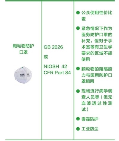 工業(yè)防顆粒物口罩:顆粒物的阻隔能力與醫(yī)用防護(hù)口罩類(lèi)似,可用于工業(yè)防塵和霧霾防護(hù)。由于該類(lèi)口罩無(wú)血液透過(guò)性測(cè)試,不推薦公眾佩戴,也不能用于手術(shù)室等有衛(wèi)生學(xué)要求的區(qū)域。(橫列為口罩的圖片+名稱(chēng)、產(chǎn)品標(biāo)準(zhǔn)、建議應(yīng)用場(chǎng)景。圖片來(lái)源:中國(guó)疾控中心)