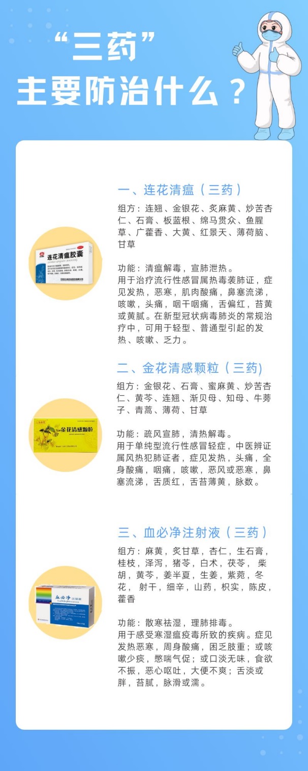 “三方”中的清肺排毒湯是源自于《傷寒論》的5個(gè)經(jīng)典方劑融合組成的,是國家診療方案中推薦的通用方劑?;瘽駭《痉胶托螖《痉绞窃谖錆h前線的臨床救治過程中,根據(jù)臨床觀察總結(jié)出來的有效方劑,也已獲批上市。準(zhǔn)確地說,目前“三方三藥”已成為了“六藥”。