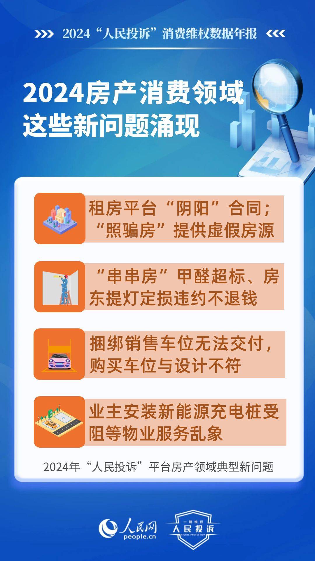 新問題體現(xiàn)在:租房平臺“陰陽”合同、提供虛假房源、甲醛超標(biāo)不退款、違約不退定金/押金等;捆綁銷售車位無法交付,購買車位與設(shè)計不符,人防車位/不合格機(jī)械車位當(dāng)普通車位賣,無法正常使用,業(yè)主安裝充電樁受阻等。