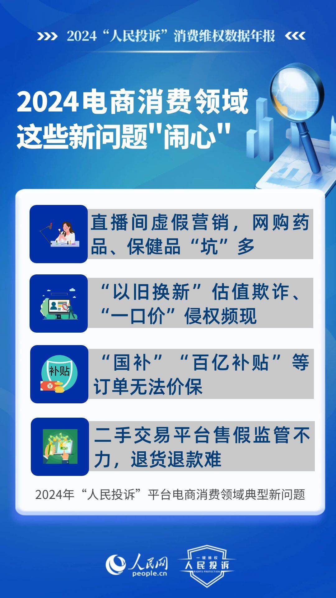 新問題體現(xiàn)在:直播間虛假營銷,購買玉石/網(wǎng)課/旅游產(chǎn)品等消費(fèi)“踩雷”多;“以舊換新”估值欺詐、“一口價”侵權(quán)頻現(xiàn);“國補(bǔ)”“百億補(bǔ)貼”訂單不給價保;二手交易平臺對商家售假監(jiān)管不力、“陰陽”檢測、退貨退款難;網(wǎng)購藥品/保健品/醫(yī)療器械“坑”多等。