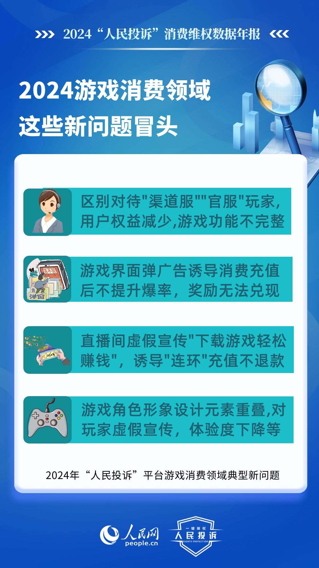 在游戲類,老問題主要有:未成年人網(wǎng)游消費(fèi)不規(guī)范,平臺以“免費(fèi)”“紅包”誘導(dǎo)點(diǎn)擊充值,未身份驗(yàn)證、支付環(huán)節(jié)無提示,提交證據(jù)申請退款遭拒或退款金額不合理;虛假宣傳游戲內(nèi)容誘導(dǎo)充值點(diǎn)券,玩家實(shí)際回報/游戲體驗(yàn)與預(yù)期不符;無故封號、游戲裝備丟失、賬號被盜、系統(tǒng)漏洞導(dǎo)致玩家利益受損,客服不回應(yīng)、平臺不理;系統(tǒng)漏洞、卡頓閃退、匹配機(jī)制失衡等網(wǎng)游體驗(yàn)差等。