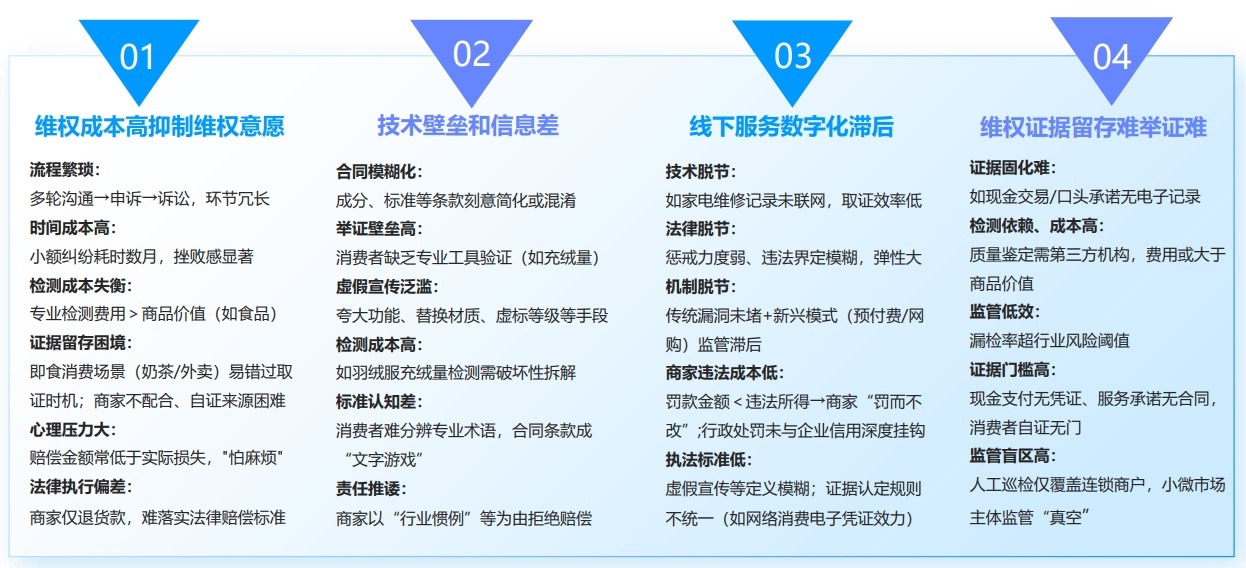 通過(guò)對(duì)消費(fèi)維權(quán)新老問(wèn)題的梳理和分析,“人民投訴”認(rèn)為,傳統(tǒng)問(wèn)題多因信息不對(duì)稱(chēng)和監(jiān)管漏洞,而新難題則疊加了技術(shù)復(fù)雜性(如算法操控)和新業(yè)態(tài)模式(如直播、盲盒),維權(quán)難度升級(jí)。