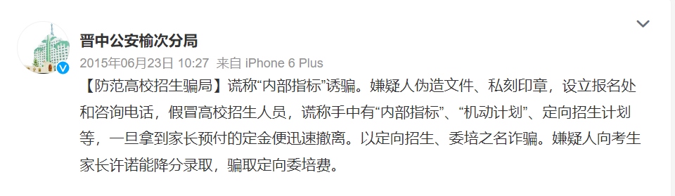 針對上述四種詐騙類型,廈門市打擊治理電信網(wǎng)絡(luò)新型違法犯罪中心民警洪恒亮表示,部分考生及家長“病急亂投醫(yī)”的焦慮心理和一些孩子希望盡早為家庭減輕經(jīng)濟(jì)負(fù)擔(dān)的迫切需求使得上述精準(zhǔn)詐騙得以有機(jī)可乘。不法分子通過看似專業(yè)的短信或電話通知,再輔以以假亂真的“證明材料”,具有一定的迷惑性。