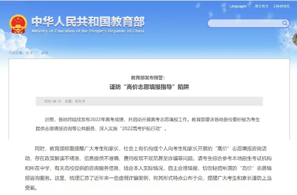 近日,教育部發(fā)布預(yù)警,提醒考生謹(jǐn)防“高價志愿填報指導(dǎo)”陷阱。有網(wǎng)站虛假宣傳擁有所謂“內(nèi)部信息”,自稱掌握內(nèi)部大數(shù)據(jù),能夠“精準(zhǔn)定位院校”等等。事實上,每年高考填報志愿前,各省級招生考試機(jī)構(gòu)都會發(fā)布當(dāng)年高考成績統(tǒng)計情況和近年來各高校錄取分?jǐn)?shù)情況,并不存在市面上的咨詢機(jī)構(gòu)或個人聲稱的“內(nèi)部信息”。還有一些咨詢機(jī)構(gòu)假冒所謂志愿填報專家身份。該咨詢機(jī)構(gòu)打出廣告,稱團(tuán)隊的專家“獲得高考志愿規(guī)劃師認(rèn)證”“來自著名高?!钡取J聦嵣?,有關(guān)部門從未發(fā)放過“高考志愿規(guī)劃師”這類職業(yè)資格證書。該機(jī)構(gòu)一些所謂“志愿規(guī)劃師”都是臨時招募的社會人員,按照總部提供的“臺詞”給考生和家長輔導(dǎo)。家長購買這些機(jī)構(gòu)的服務(wù)不僅花了冤枉錢,而且可能報錯志愿?! ?/p>
