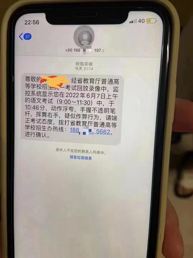 “尊敬的考生×××,經(jīng)省教育廳普通高等學(xué)校招生統(tǒng)一考試回放錄像中,監(jiān)控系統(tǒng)顯示您在2022年6月7日上午的語文考試(9:00—11:30)中,于10時46分,動作浮夸,手握不透明筆桿,揮舞右手,疑似作弊行為,請端正考試態(tài)度,撥打省教育廳普通高等學(xué)校招生辦熱線:188×××進(jìn)行確認(rèn)?!苯?,有考生向廈門警方反映,自己接到了聲稱是“省教育廳普通高等學(xué)校招生辦”的通知短信,懷疑是詐騙信息。該短信在開頭準(zhǔn)確寫明了考生姓名,并在結(jié)尾要求考生主動撥電話號碼進(jìn)行確認(rèn)。經(jīng)與教育部門核實確認(rèn),高考作弊違規(guī)行為不會以短信、電話、鏈接等方式通知。廈門警方提醒,不法分子通過非正常渠道搜集到考生信息,并向考生發(fā)送所謂“疑似作弊”的通知短信,考生一旦回?fù)茈娫?,就可能被不法分子以“處理作弊行為”為由實施詐騙?! ?/p>