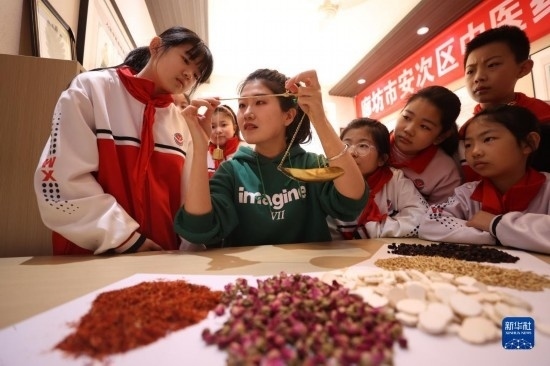 3月24日,河北省廊坊市第五小學學生在該校國醫(yī)館內跟隨老師識別中藥。