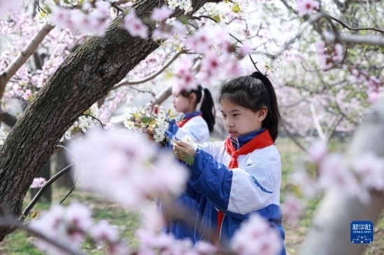 3月28日,內(nèi)丘縣大都城小學學生在梨園疏花。