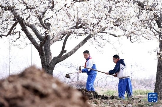 3月28日,內(nèi)丘縣大都城小學學生在梨園鋤草。