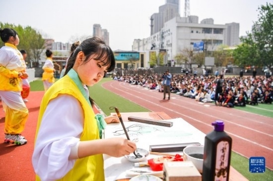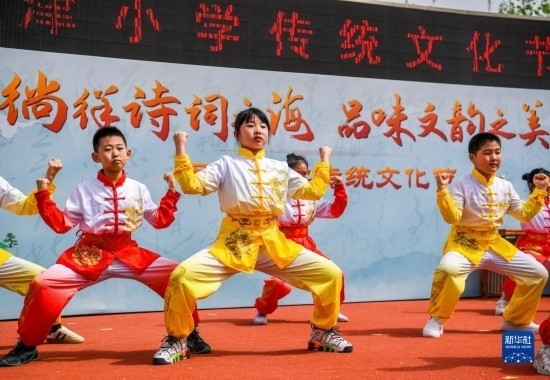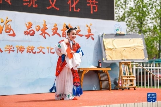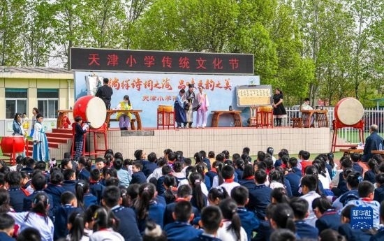 當(dāng)日,以“徜徉詩詞之海,品味文韻之美”為主題的傳統(tǒng)文化節(jié)在天津小學(xué)舉行。學(xué)生們?cè)诶蠋煹闹笇?dǎo)下參與國學(xué)朗誦、京劇選段表演、書畫展示等活動(dòng),感受傳統(tǒng)文化的魅力。