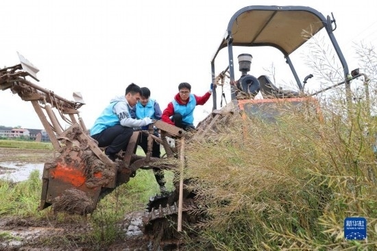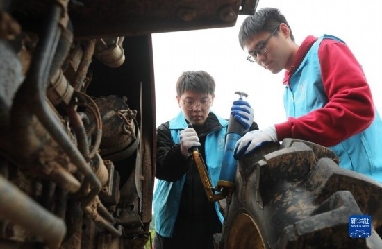 4月29日,在衡陽縣西渡鎮(zhèn)新橋村,南華大學(xué)的大學(xué)生志愿者在檢修農(nóng)機(jī)。