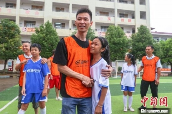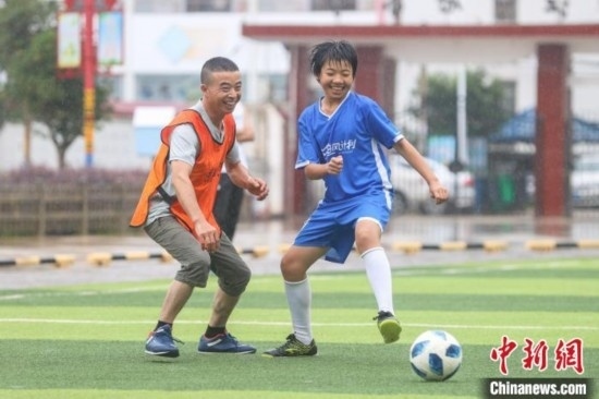 “今天第一次和爸爸踢球,我特別高興和感動。他踢得很好,還帶球過了我?guī)状?。我希望爸爸以后能多陪我踢球?!?4日,在江西贛州尋烏縣澄江中心校的足球場上,來自該校晨曦女子足球隊的隊員廖怡菱和其他四位隊員在父親節(jié)前夕,驚喜地見到了自己身在外地工作的父親,并第一次和父親一起踢球,進行了一場特別的親子足球賽。