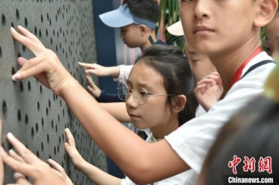 8月7日,學員用手觸摸國家大劇院內的特色墻壁。中新社記者 李駿 攝