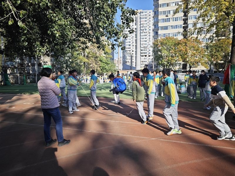北醫(yī)附小學(xué)生課間在操場上跳長繩。