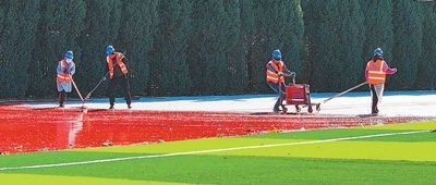 11月23日,工人在長溝中學操場進行塑膠跑道彈性層施工。 以上圖片均為宋濤攝 |