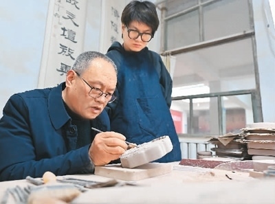 絳州澄泥硯制作技藝省級(jí)代表性傳承人藺濤(左)指導(dǎo)兒子藺霄鱗處理澄泥硯雕刻的細(xì)節(jié)。