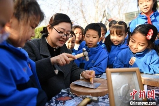 3月11日,河北省級非物質(zhì)文化遺產(chǎn)項(xiàng)目“郭氏鐵板浮雕”傳承人郭墨涵(黑衣)為學(xué)生展示技藝。中新網(wǎng)記者 翟羽佳 攝