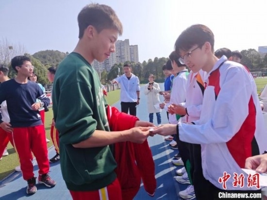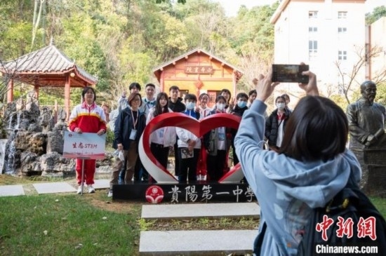 3月19日,部分兩地學生在貴陽市第一中學合影留念。唐哲 攝