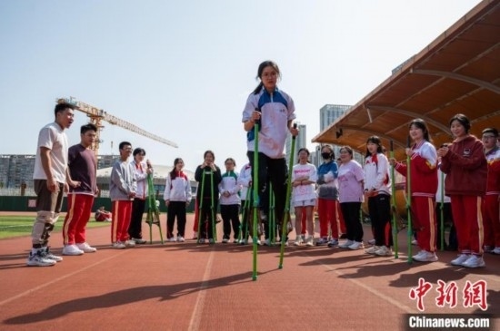 3月19日,香港學生體驗少數(shù)民族傳統(tǒng)體育項目《高蹺》。唐哲 攝