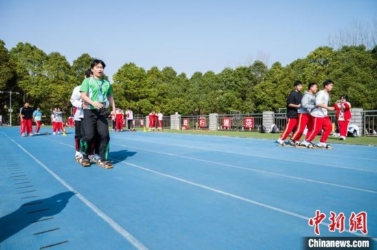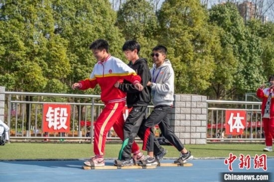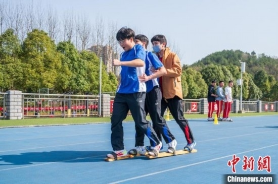 3月19日,兩地學生一起體驗少數(shù)民族傳統(tǒng)體育項目《板鞋競技》。唐哲 攝