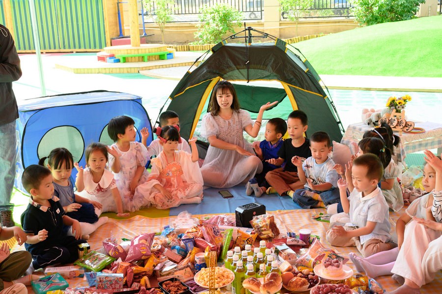 當(dāng)日,在幼兒園的操場(chǎng)上,五顏六色的野餐墊鋪,可愛(ài)俏皮的帳篷,精致的裝飾,數(shù)不勝數(shù)的水果點(diǎn)心,小朋友們?cè)陉帥鎏幈M情享受著美味,與老師們一起享受著夏日里野餐派對(duì)的美好。