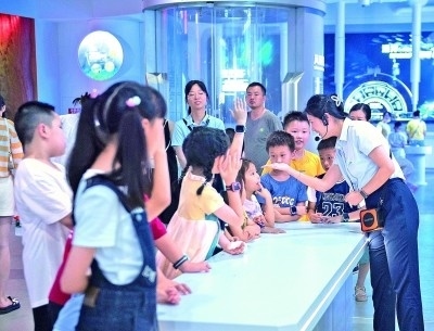 暑期,安徽省科技館在常設(shè)展覽之外開展研學(xué)營(yíng)、科學(xué)課程、科學(xué)實(shí)驗(yàn)等科普活動(dòng),讓孩子們?cè)谪S富多彩的活動(dòng)中感受科技魅力。圖為7月10日,工作人員與參加研學(xué)營(yíng)的小朋友互動(dòng)。(新華社記者 傅天攝)