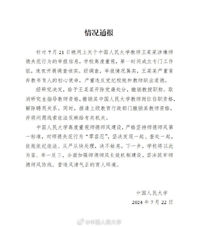 通報中稱,學(xué)校高度重視,第一時間成立專門工作組,連夜開展調(diào)查核實。經(jīng)研究決定,給予王某某開除黨籍處分,撤銷教授職稱,取消研究生指導(dǎo)教師資格,撤銷其中國人民大學(xué)教師崗位任職資格,解除聘用關(guān)系。同時,報請上級教育行政部門撤銷其教師資格,并將問題線索依法反映給有關(guān)機關(guān)。