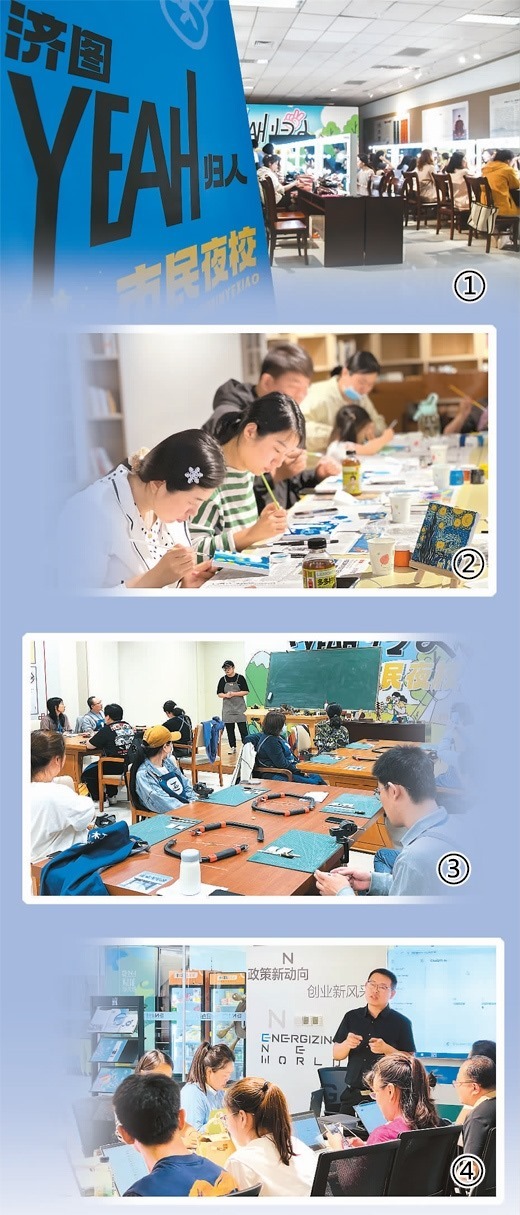 濟南“‘YEAH歸人’泉民夜?!痹谡n程設(shè)置、校區(qū)布局、師資配備等方面均進行了全面提升?!霸黾咏虒W點后,市民不僅能在專業(yè)機構(gòu)里上夜校,也能夠在家門口,在熱門文化‘新空間’里就近選擇自己心儀的課程?!睗鲜形幕^副館長張鈞善說。
