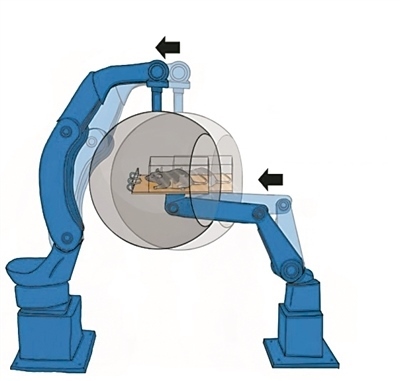 為了破解動(dòng)物在完全黑暗的管道、隧道中也能迅速轉(zhuǎn)彎、穿越障礙,并準(zhǔn)確地抵達(dá)目的地的秘密,科學(xué)家們?cè)O(shè)計(jì)了一種獨(dú)特的運(yùn)動(dòng)模擬器。該模擬器采用同步的工業(yè)機(jī)械臂來模擬不同的運(yùn)動(dòng)狀態(tài)。實(shí)驗(yàn)中,老鼠被放在模擬器中接受各種運(yùn)動(dòng)刺激,儀器同時(shí)報(bào)告它們感知到的運(yùn)動(dòng)方向。結(jié)果顯示,老鼠對(duì)極其微小的氣流變化都異常敏感,它們確實(shí)能夠利用這種氣流信息,增強(qiáng)自身對(duì)運(yùn)動(dòng)的感知和判斷力。