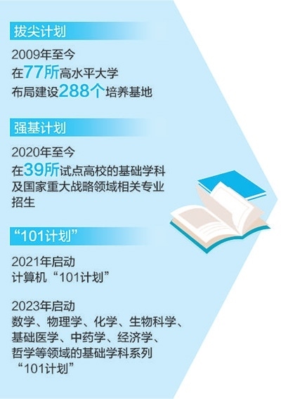 高東鋒:教育部依托高水平大學累計建設288個基礎學科拔尖學生培養(yǎng)基地,強化有組織拔尖創(chuàng)新人才培養(yǎng),在計算機科學、數(shù)學、基礎醫(yī)學、經(jīng)濟學等9個領域?qū)嵤?01計劃”,建設核心課程、教材、師資團隊和實踐項目?;A學科拔尖學生培養(yǎng)計劃實施高校建設了一批榮譽學院、書院等“育人試驗區(qū)”,逐漸形成了“選拔設通道、培養(yǎng)留空間、評價長周期、協(xié)同聚合力”的有效模式。