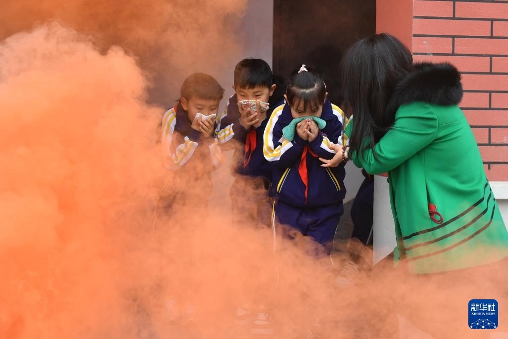 3月31日,在山東省青島市市北區(qū)杭州路小學(xué)開展的校園消防安全主題教育活動(dòng)上,師生模擬校園安全門逃生演練。