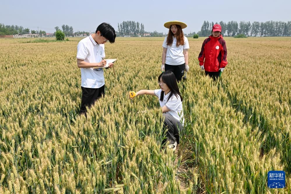 5月26日,河北省曲周縣傅莊科技小院的學(xué)生在麥田里測量植株高度。