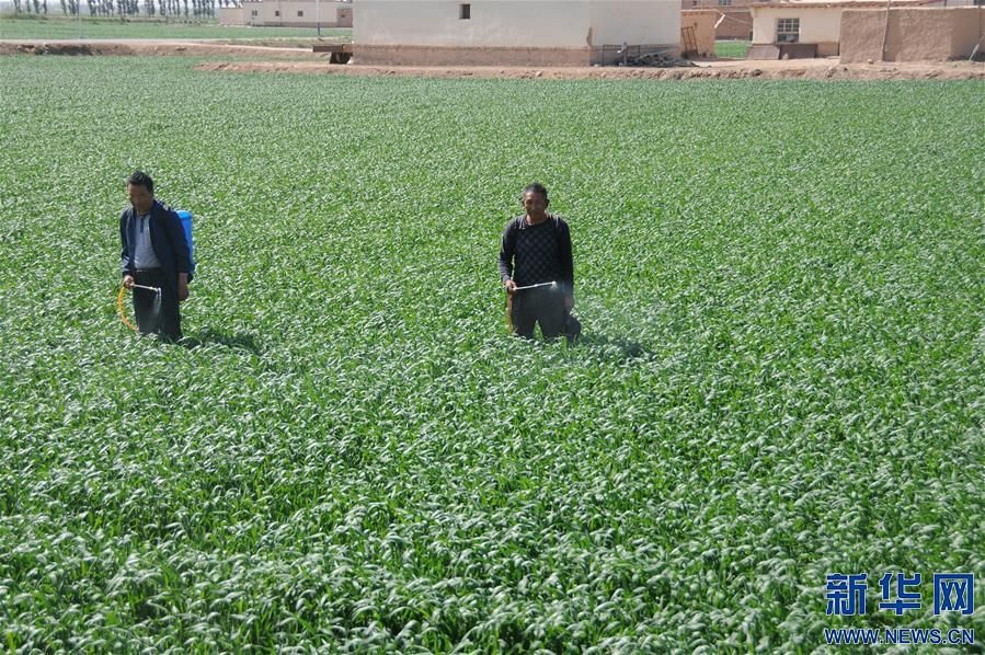 5月28日,內(nèi)蒙古巴彥淖爾市臨河區(qū)干召?gòu)R鎮(zhèn)棋盤村村民在麥田中噴藥防治病蟲害。新華社記者李云平攝