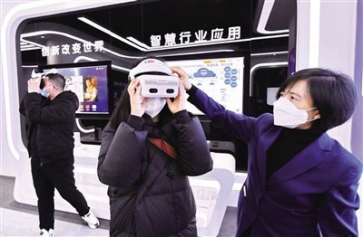1月19日,參觀者在內蒙古5G產(chǎn)業(yè)創(chuàng)新基地體驗5GVR頭盔。當日,由內蒙古和林格爾新區(qū)攜手電信、移動、聯(lián)通、鐵塔、華為建設的全區(qū)首個“內蒙古5G產(chǎn)業(yè)創(chuàng)新基地”在和林格爾新區(qū)正式揭牌。該基地的投用標志著和林格爾新區(qū)在打造數(shù)字產(chǎn)業(yè)平臺、集聚5G產(chǎn)業(yè)生態(tài)、推廣5G應用創(chuàng)新方面又取得了新突破。(記者 王磊 攝)