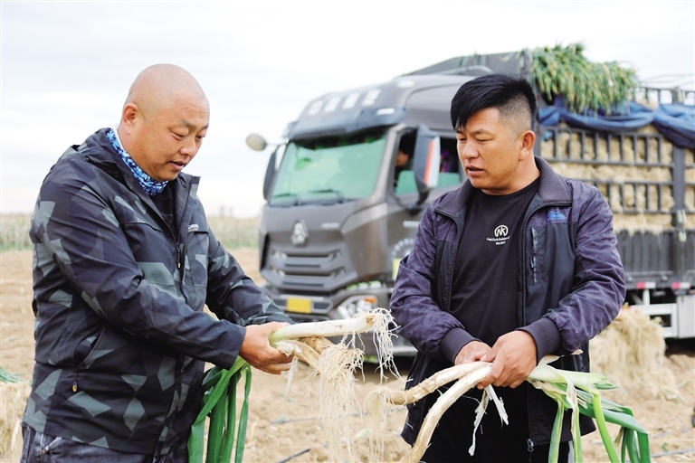 正在忙著收蔥打捆的村民于新穎說:“看這蔥長得多好!”