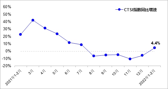 數據顯示,2022年1-2月,中國運輸生產指數(CTSI)均值為153.8點,同比增長4.4%。分結構看,CTSI貨運指數均值為188.2點,同比增長4.1%;CTSI客運指數均值為83.8點,同比增長4.7%。